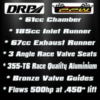 All DRP Cylinder Heads are manufactured using a permanent steel mold, ensuring consistency and clean water jackets for a cooler running motor. Made from premium 355-T6 Hard Aluminium material, these heads wont go soft. Having ductile-iron CNC 3 angle valve seats, CNC surfaces, strict quality-control checks, these are a true premium quality product.