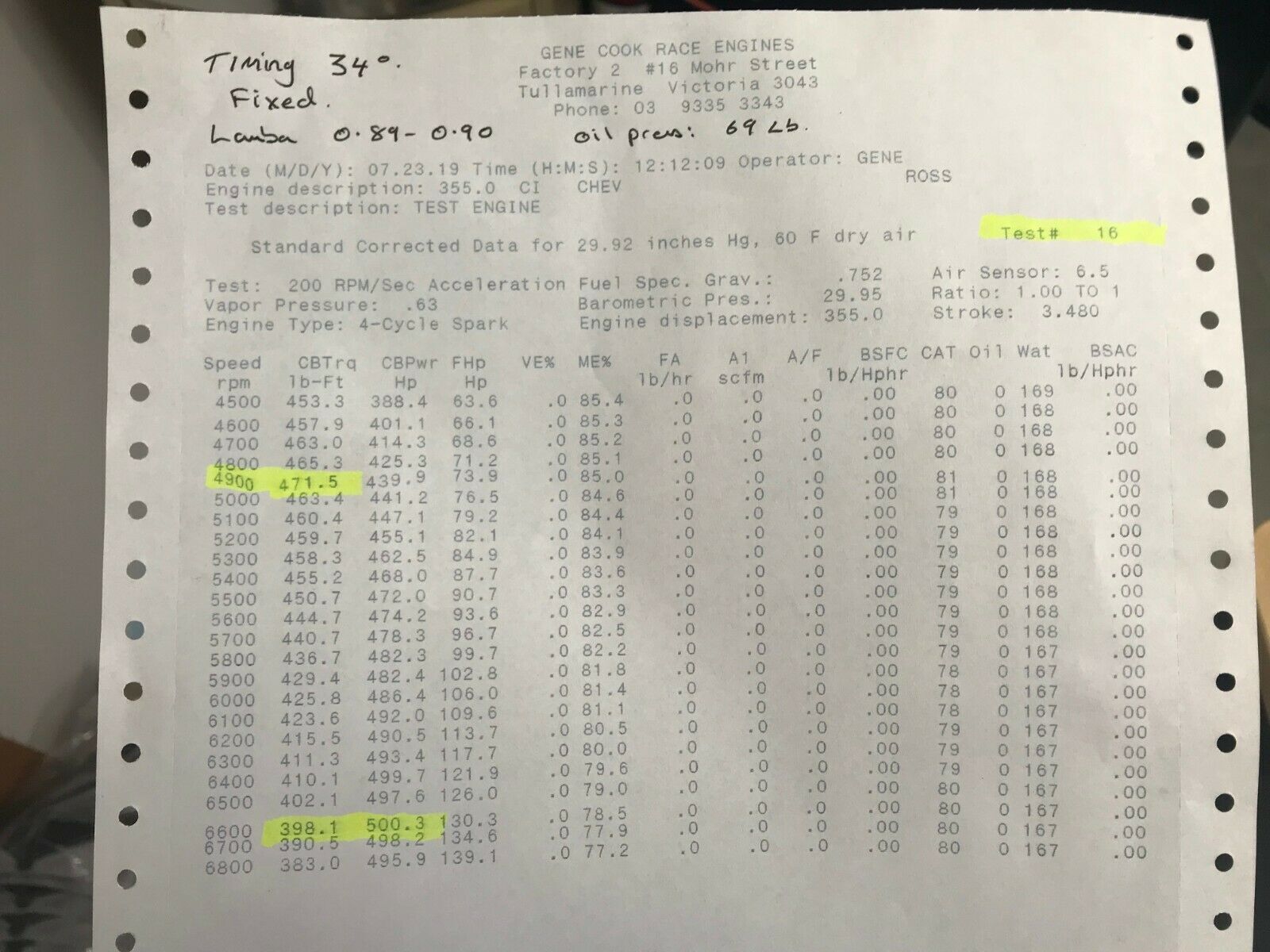 This Dyno test was carried out Using DRP Angle plug heads with a Solid Flat Tappet Camshaft,255/256 Duration and 0.540/0.534" valve lift with a 106 LSA. 1 3/4 Headers, Electrical Water pump, Edelbrock Victor Jnr Single plane intake (we feel you will achieve similar results with an air gap dual plane. 11:1 Compression with a domed Piston. 34°